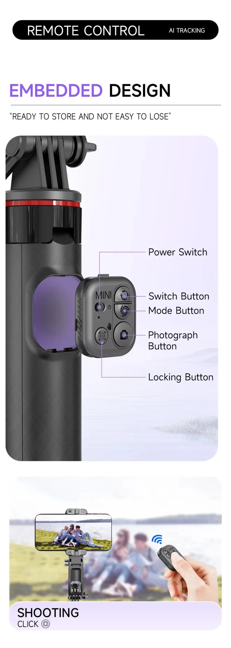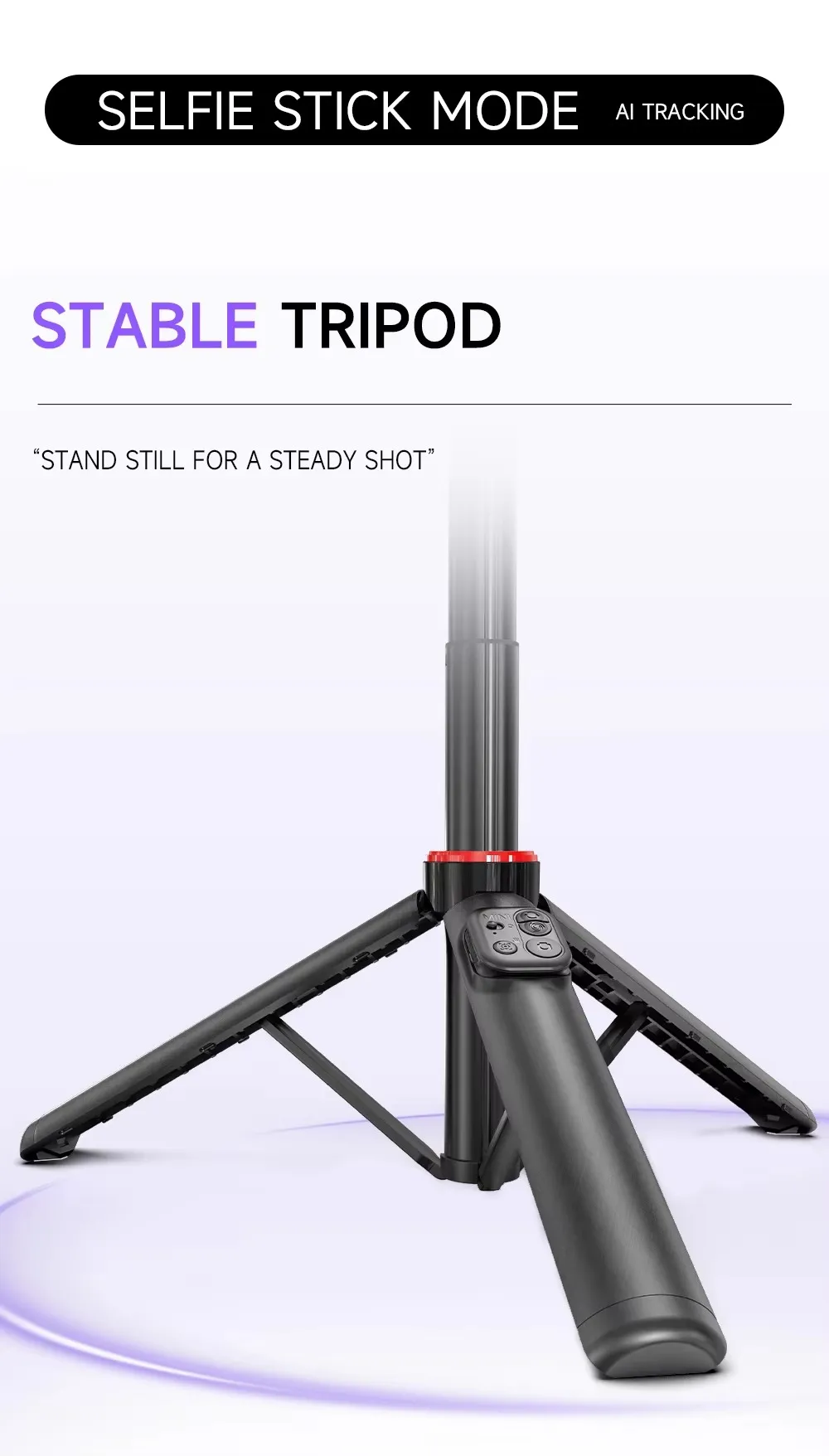 - Tripod + Selfie Stick 2-in-1 Design