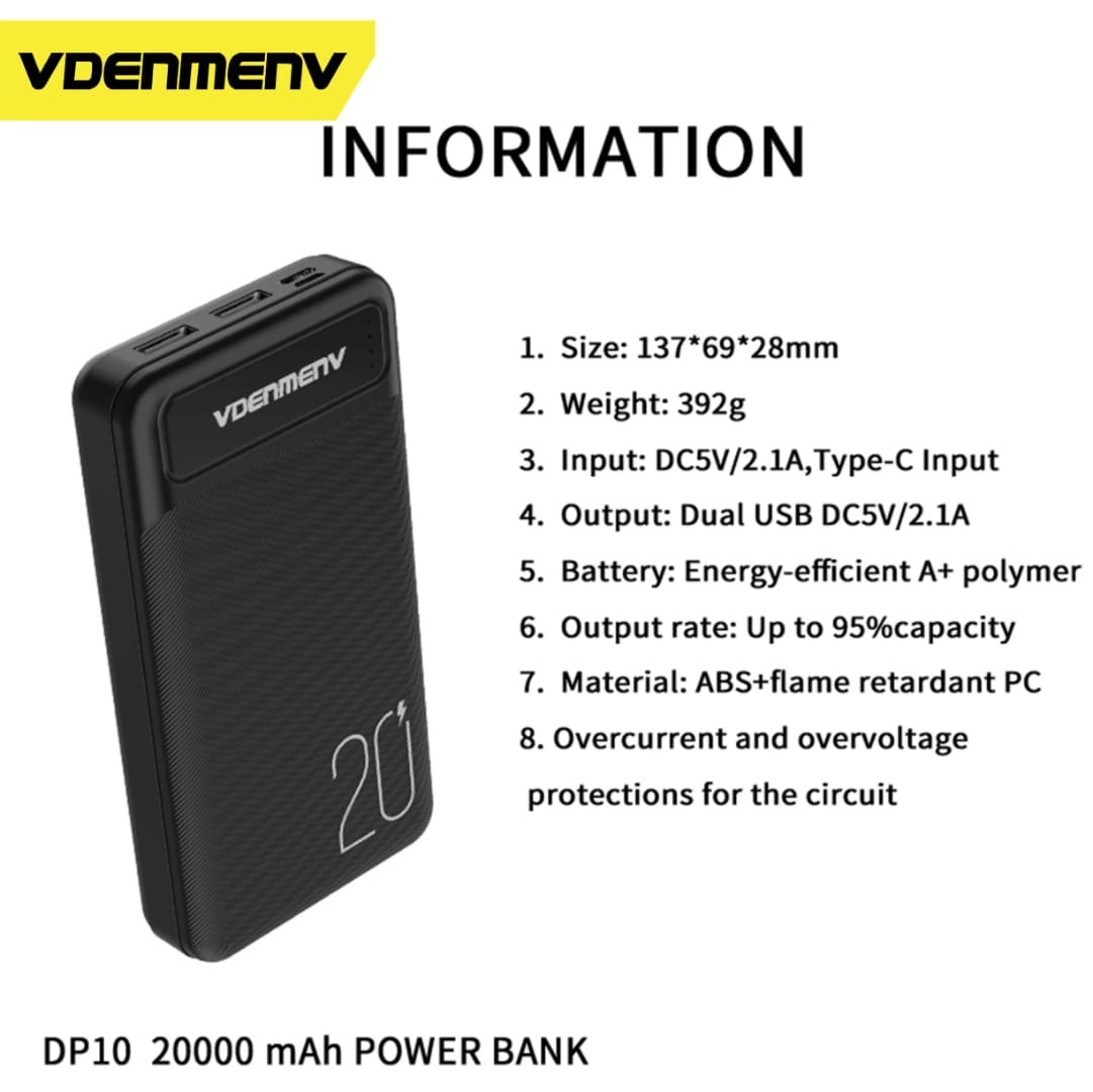 Introducing the VDENMENV DP10 Dual USB And Type C 20000mAh Power bank. With a 5V 2.1A output, this power bank ensures efficient charging for your smartphones and tablets. Equipped with dual USB and Type C ports, it offers versatility and convenience. Whether you’re on the go or traveling, this power bank provides a high-capacity battery to keep your devices powered up. Stay connected and powered throughout the day with the VDENMENV DP10 Power bank.